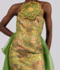 Sleeveless embroidery details on dress.