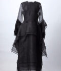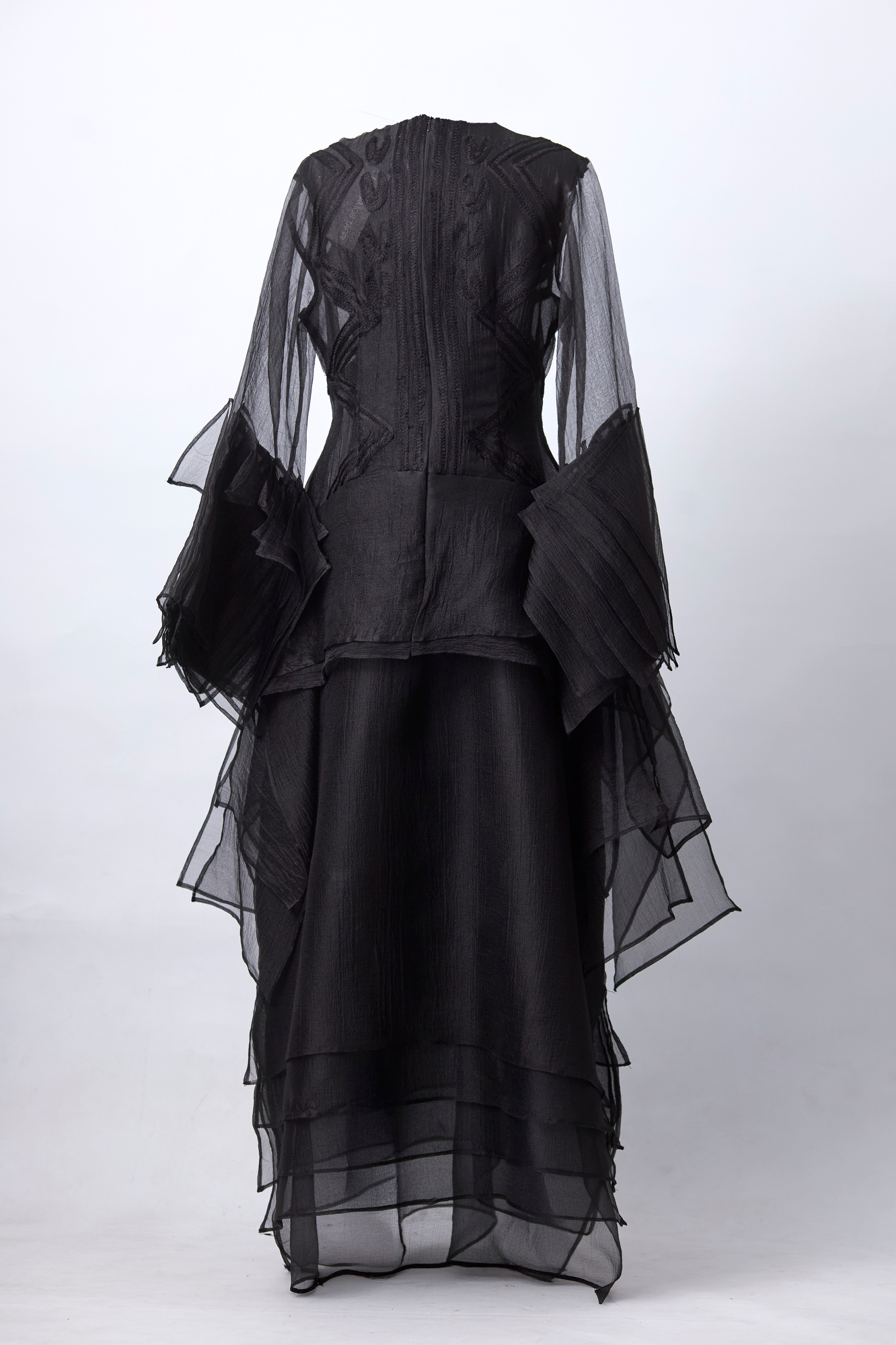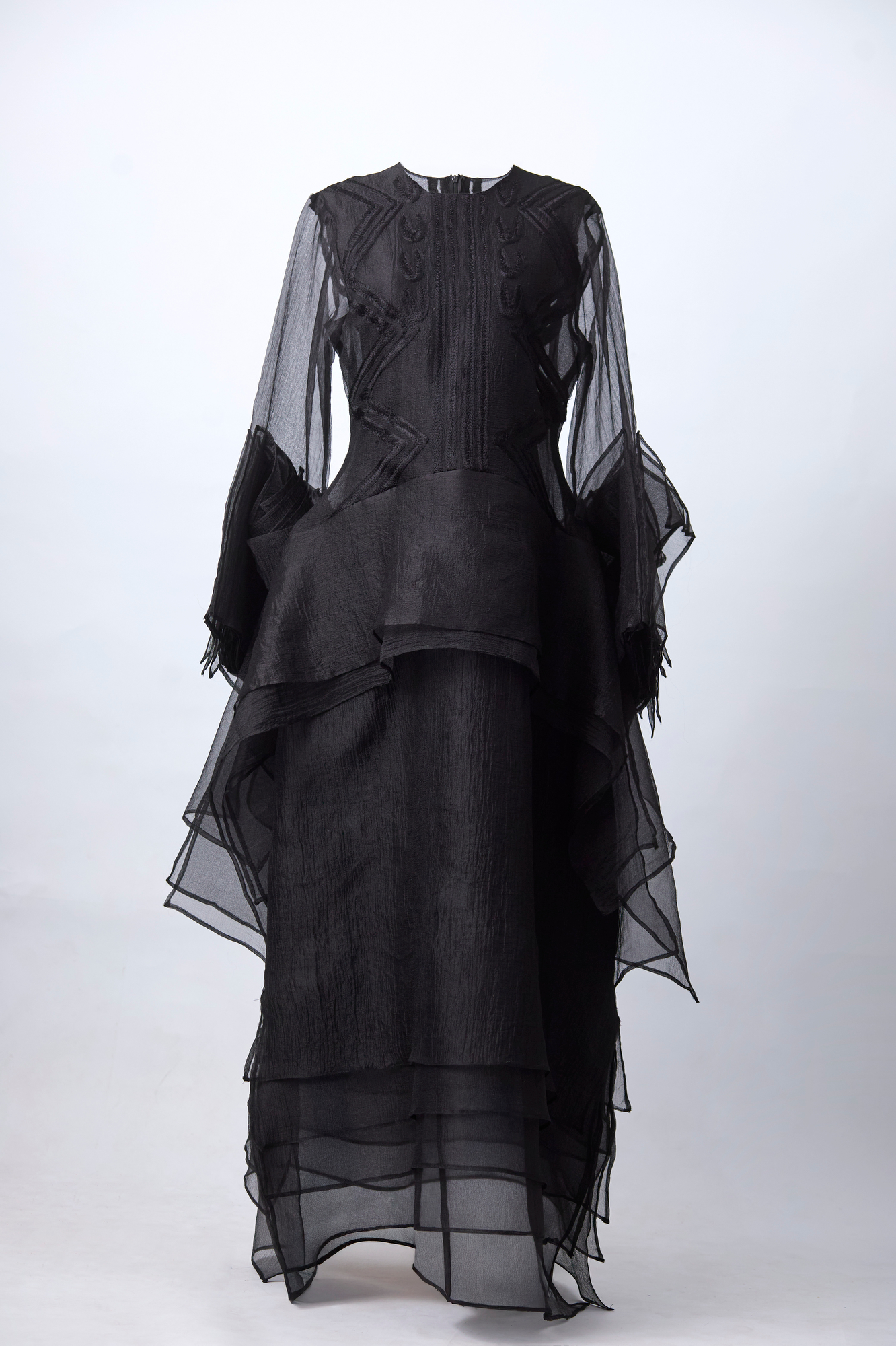 The Lia Dress is a statement piece in soft mauve organza, designed with layered sheer panels for fluid movement and dimension. The bodice features rich burgundy embroidery with heart motifs and linear detailing, adding texture and elegance. Dramatic tiered bell sleeves enhance its romantic silhouette, while the midi length offers a modern, refined finish.