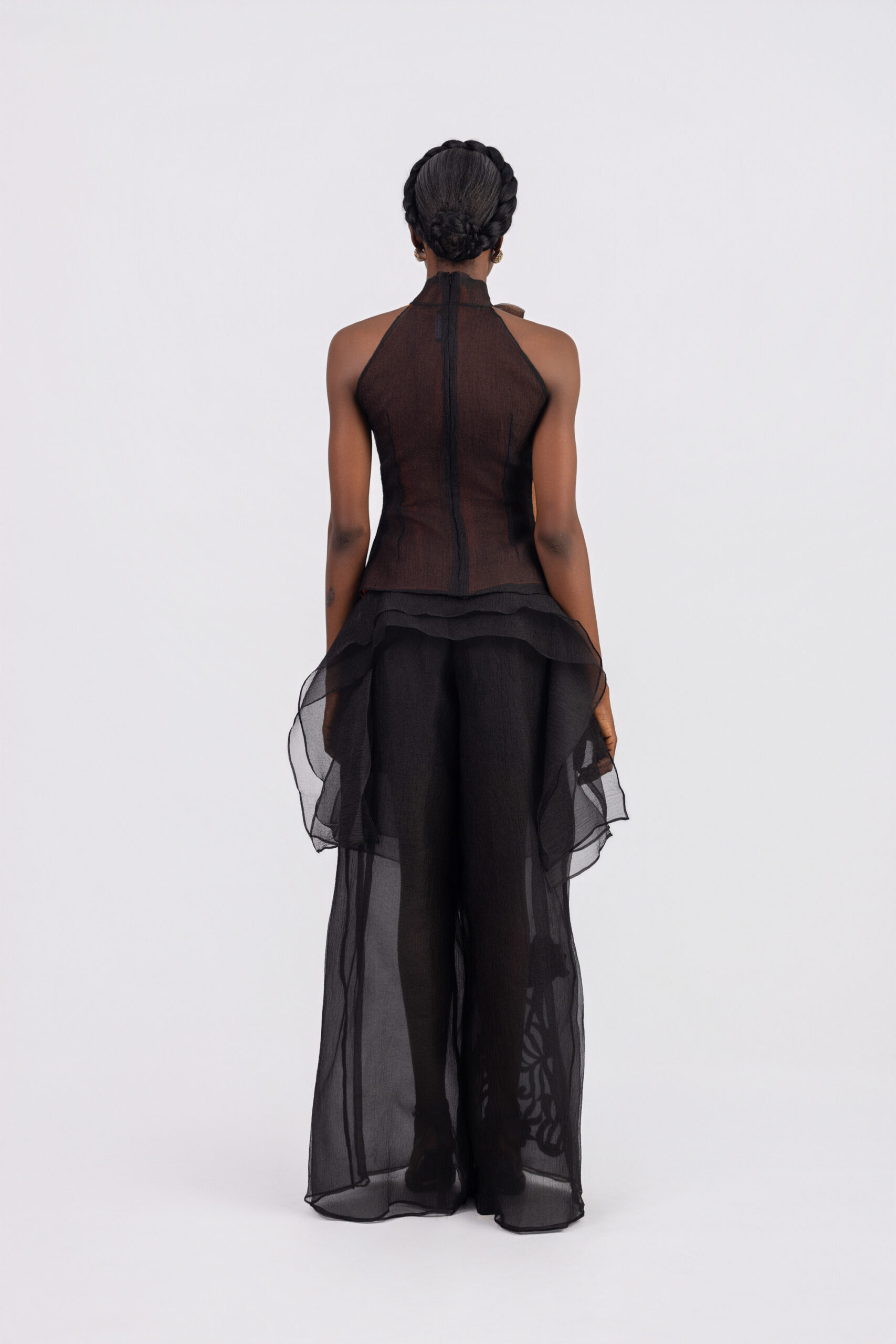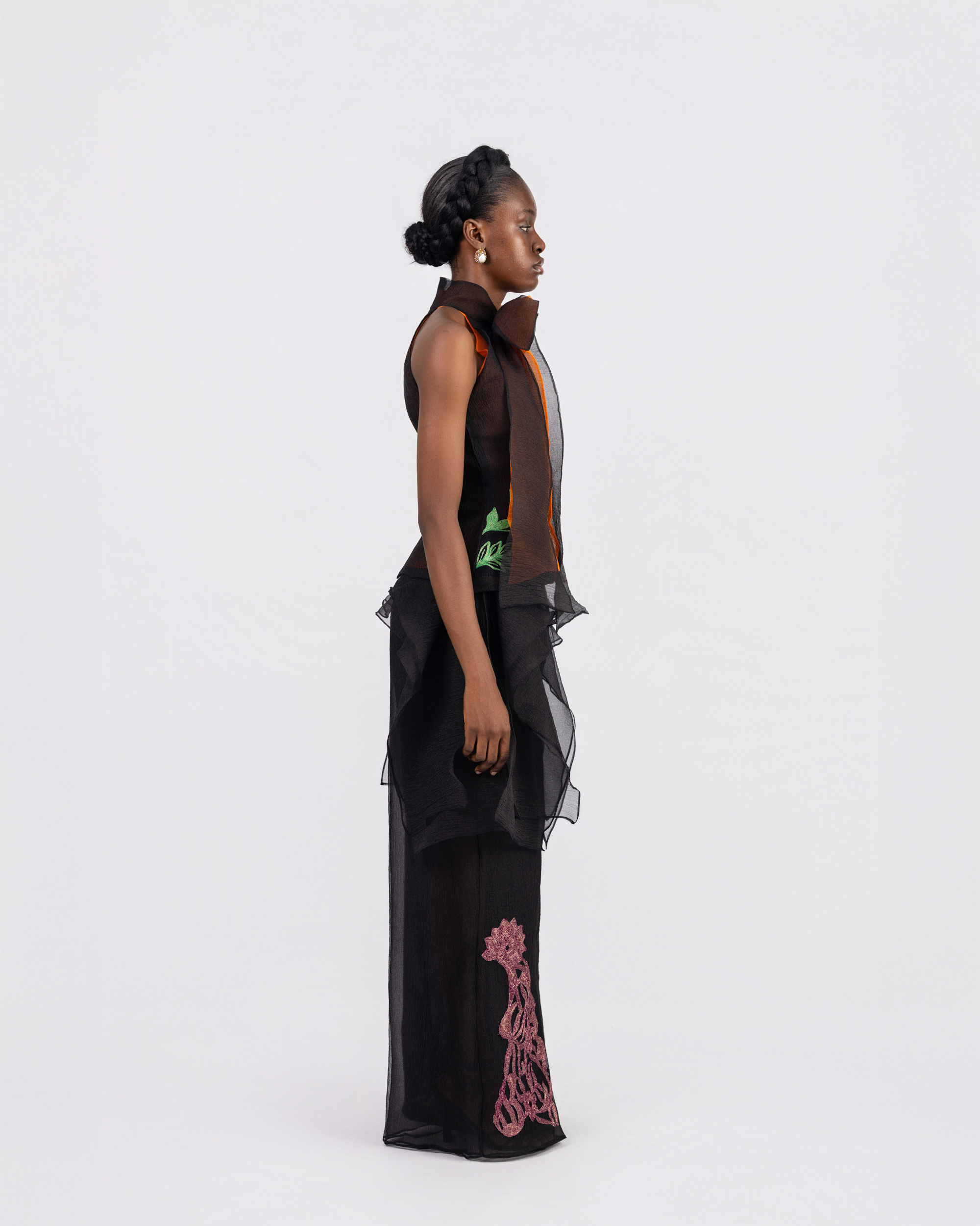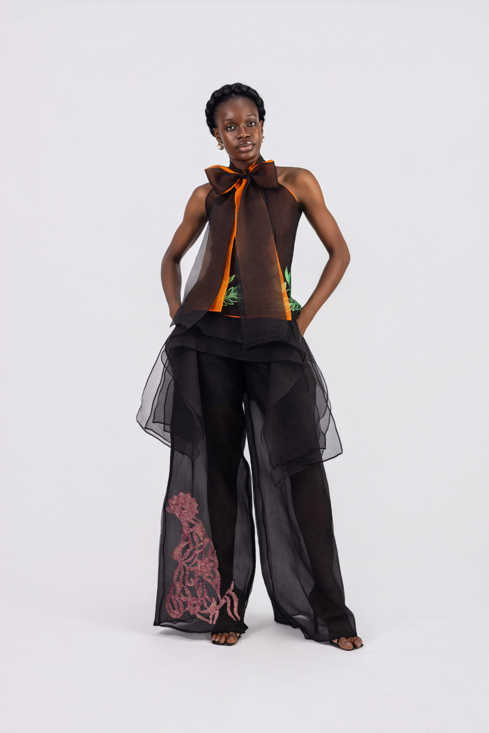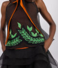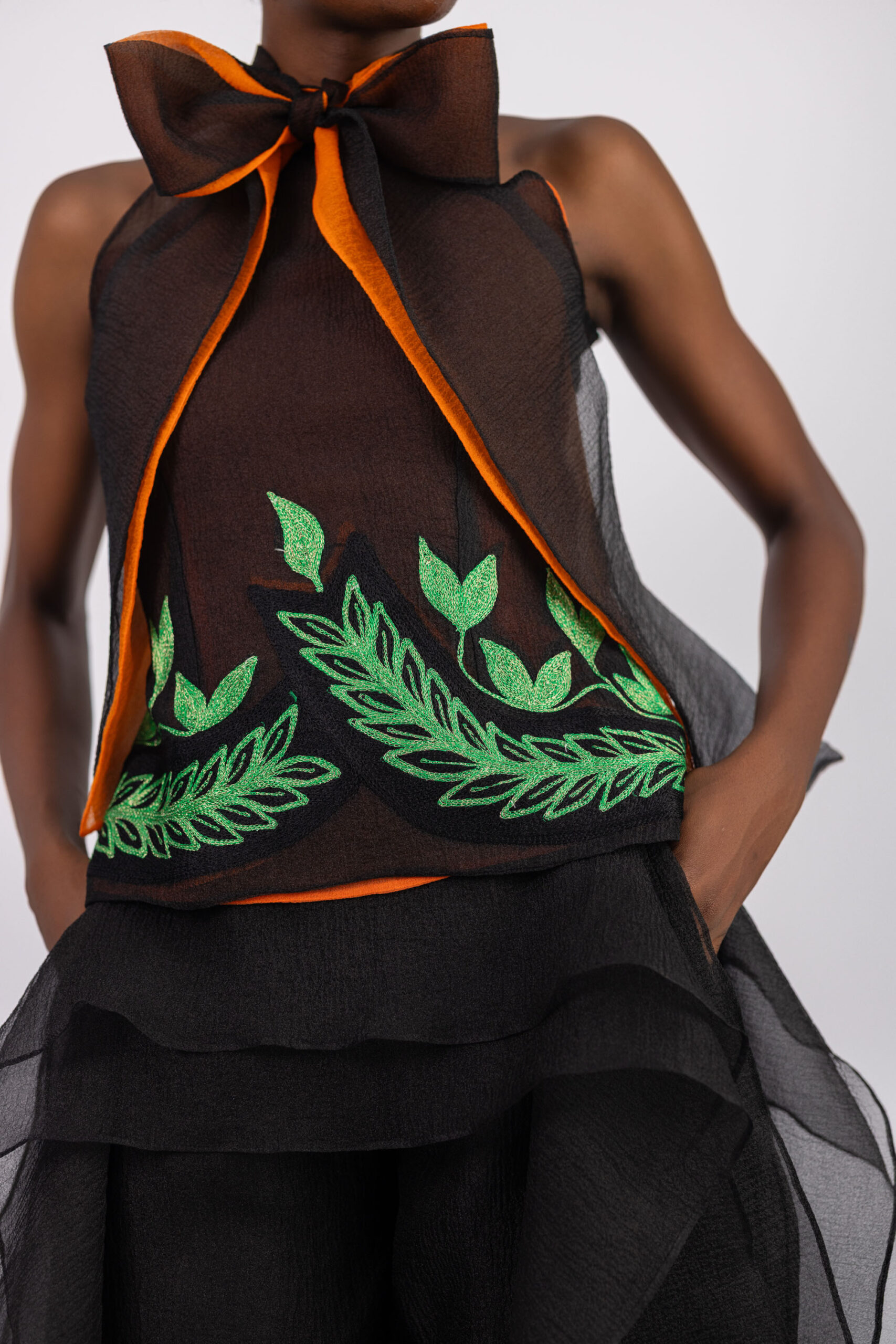 Sleeveless bow tie details, embroidery details.