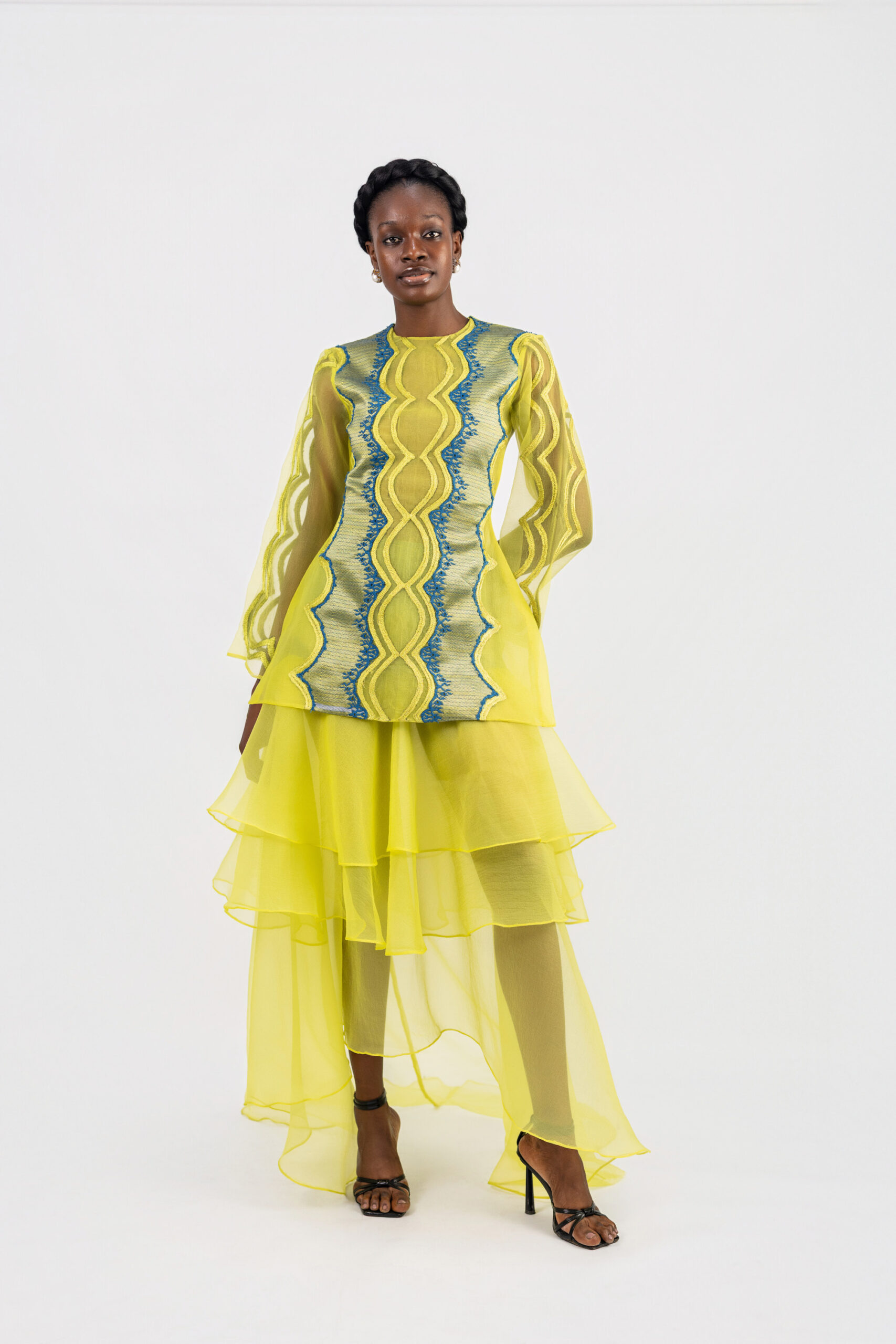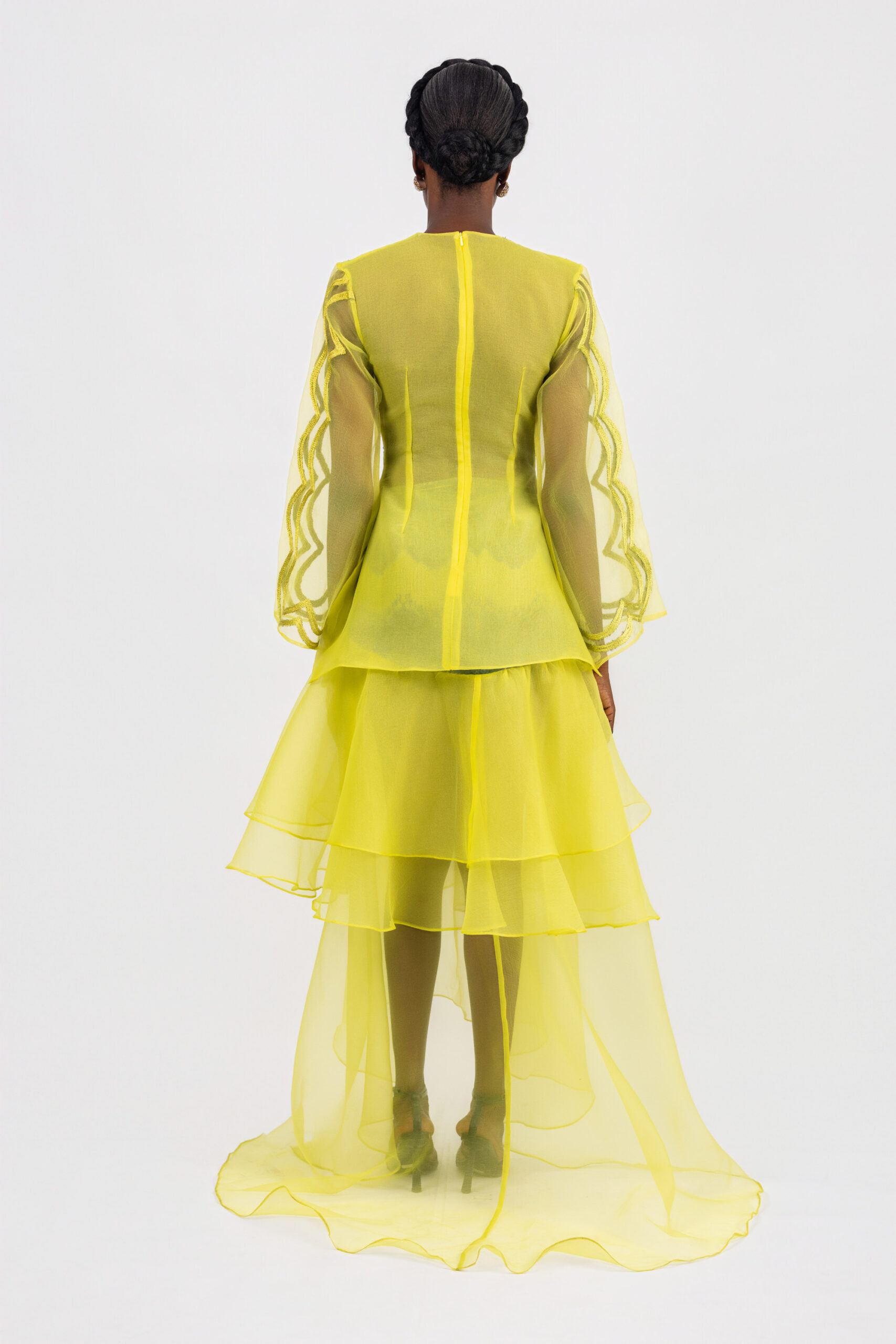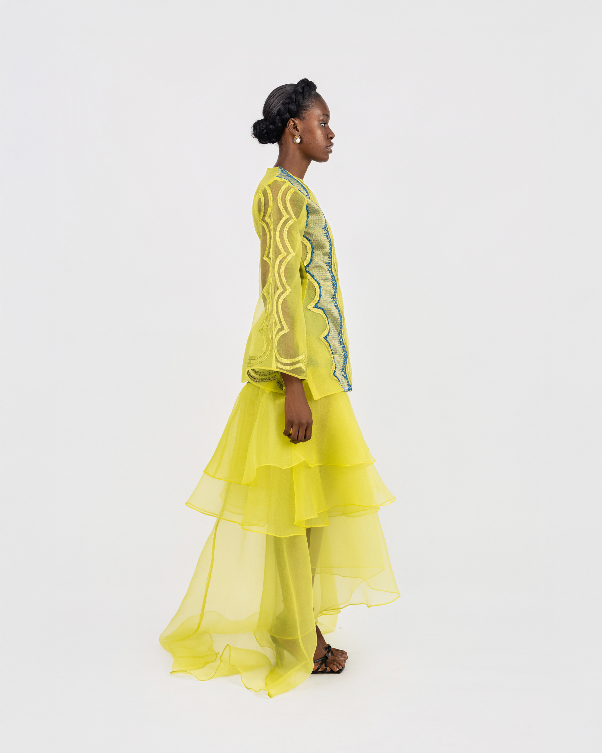 Embroidery on sleeves / flare bottom of wrapper.
