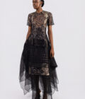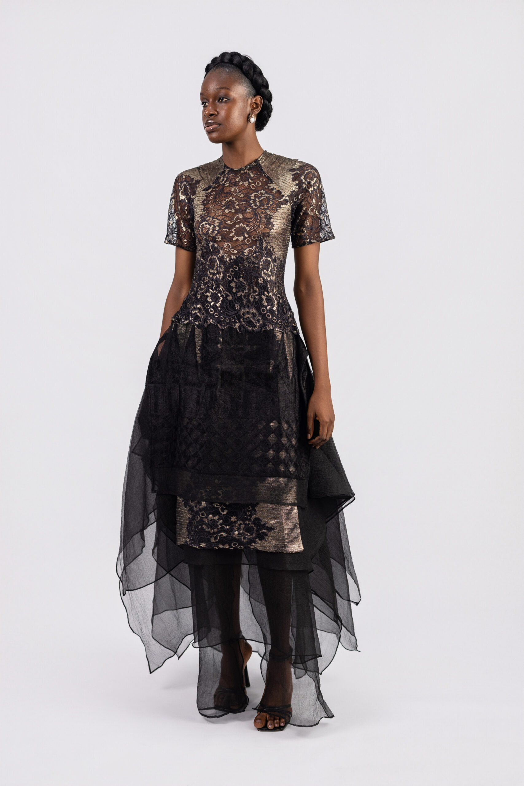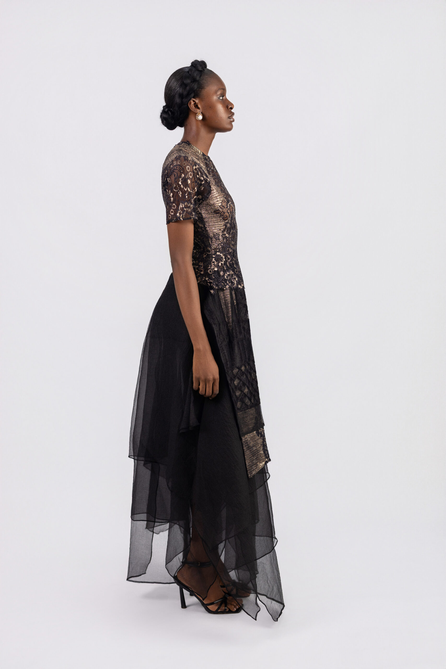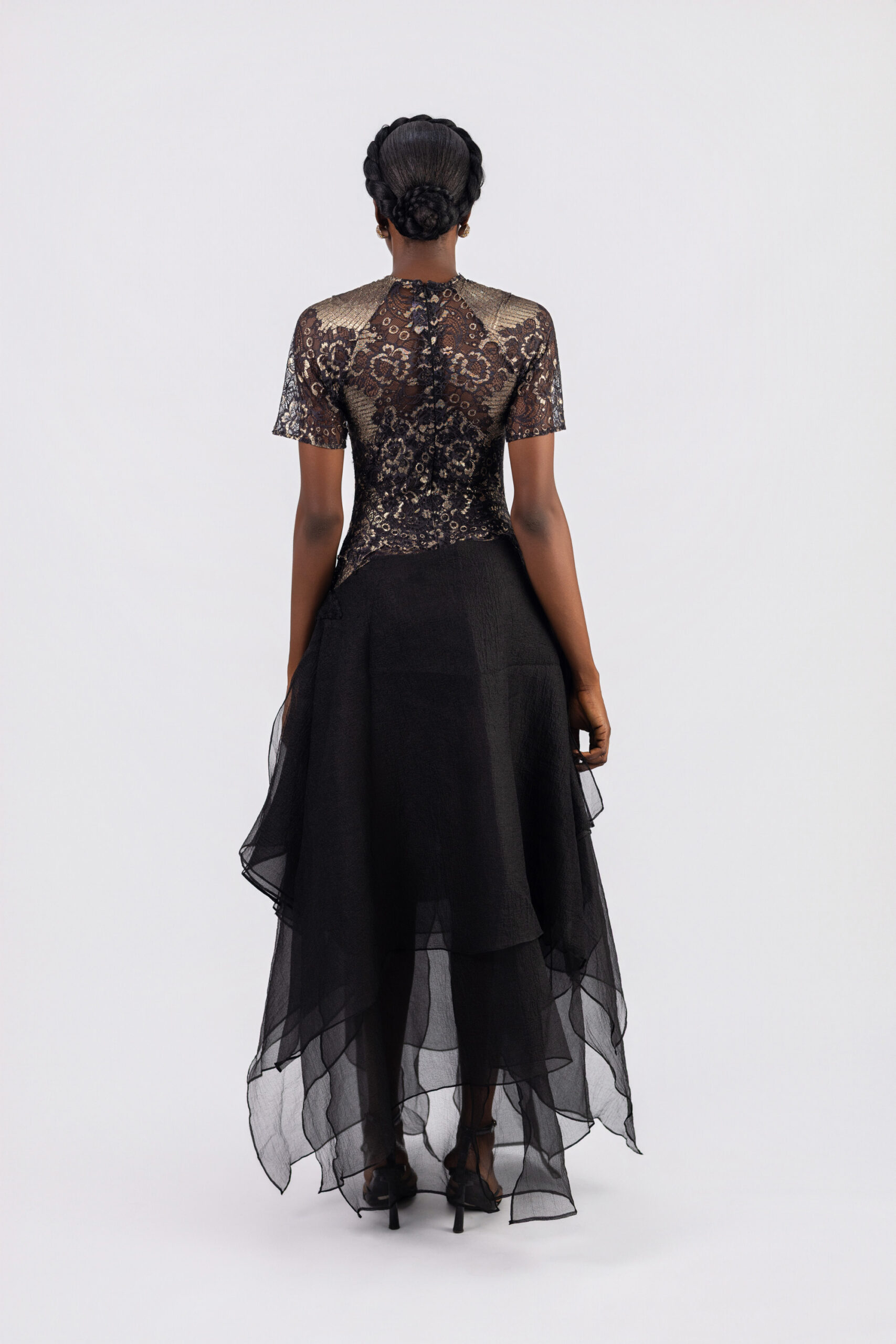 High round neckline, short sleeves. Maxi Length, layered bottom, embroidery details. Multi colored ( Black/ Metalic chantily Lace)
