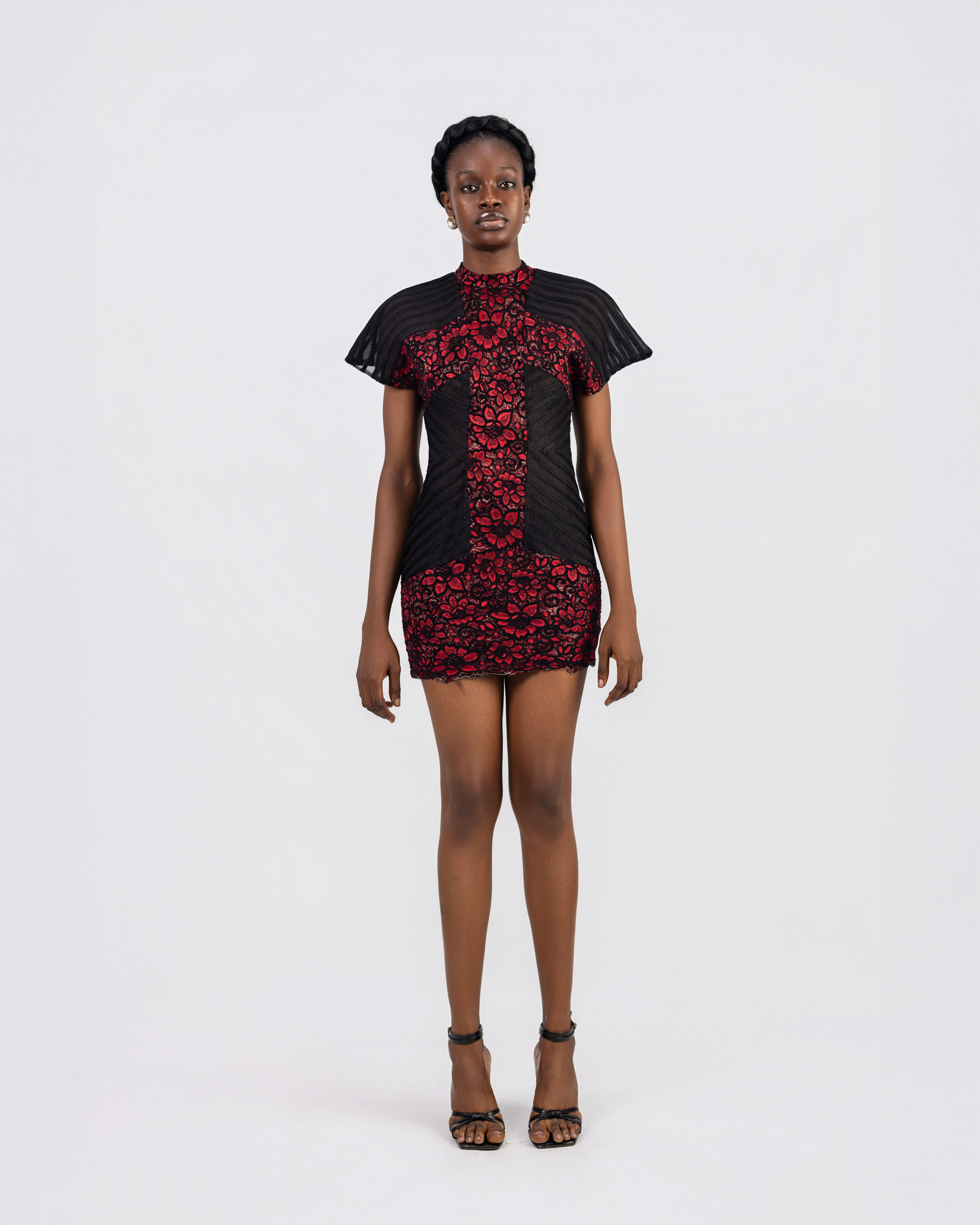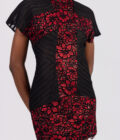 High neck, short sleeve dress, with embroidery details and zipper at the back.